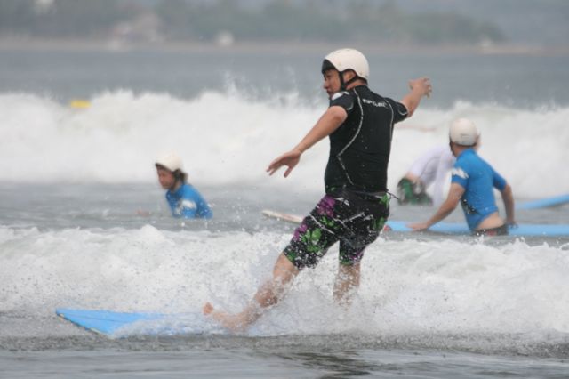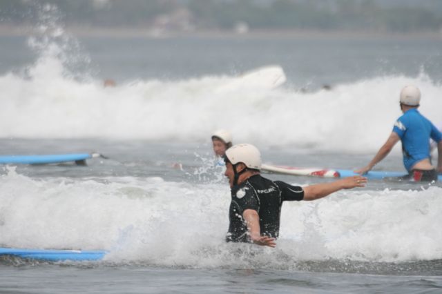 Setelah kita mencapai tempat dengan ketinggian air laut sedada, barulah kita berhenti dan menanti gelombang yang paling tinggi untuk kita tumpangi. Tidak semua gelombang pantas kita naiki, katanya harus yang paling tinggi supaya efeknya bisa sampai jauh ke pinggir pantai. Begitu gelombang yang kita anggap cukup tinggi datang, maka kita harus segera menaiki surf board, tiarap dengan tangan di pinggir pinggang, mengangkat kepala sedikit, kemudian secepat kilat melompat berdiri…huppp…. dan….jeburrrr….kecemplung laut…. karena belum bisa menyeimbangkan badan :).