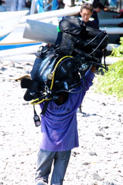 Selain itu, setiap beberapa saat, berombongan orang dengan pakaian selam berbaris menuju pantai didahului atau diikuti oleh kuli2 pengangkut tanki2 udara yang kebanyakan dilakukan oleh ibu2/anak2 penduduk setempat. Mereka mengangkut 2 – 3 tanki udara di atas kepala mereka, atau tanki berikut BCD yang beratnya kurang lebih 15 – 17 kilogram itu. Mereka dengan santainya, tanpa menggunakan alas kaki, berjalan di pantai yang penuh batu2 sebesar kerikil, kepalan tangan hingga kelapa itu. Wah luar biasa sekali…Dan itu terjadi hampir sepanjang hari hingga malam hari (night dive). Kebanyakan adalah divers asing, baik orang Asia maupun bule.