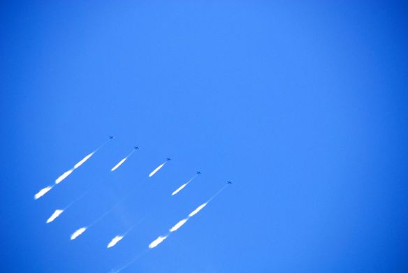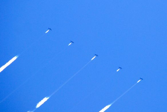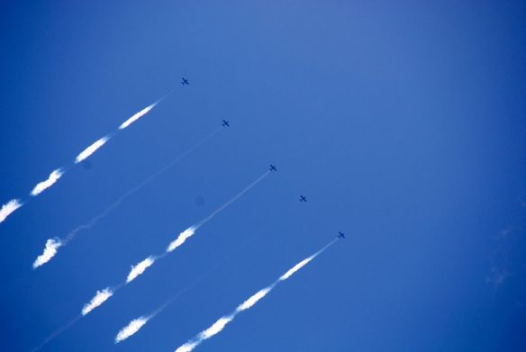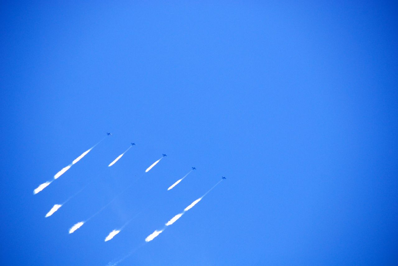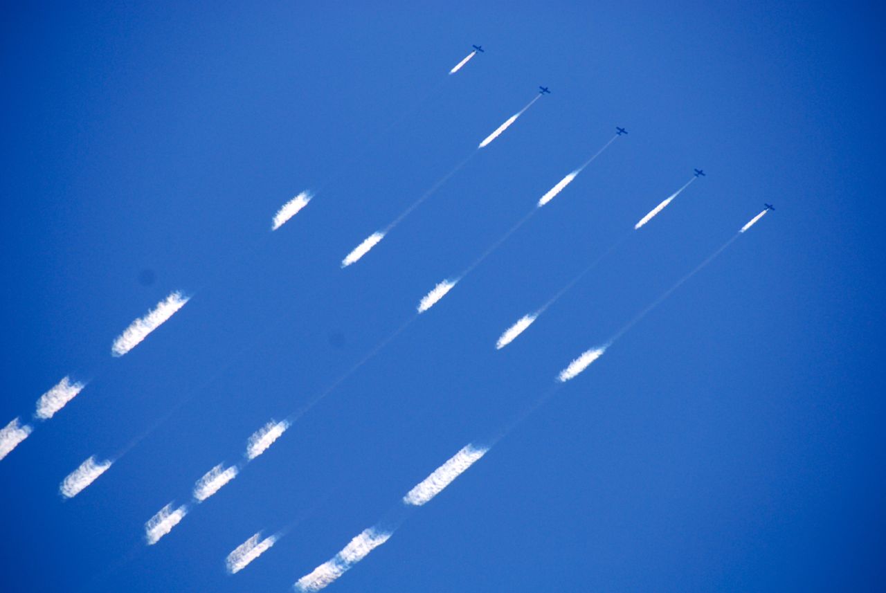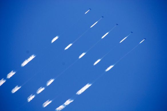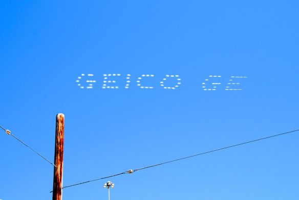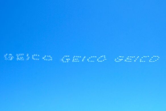 Kelihatan kan? Ada lima pesawat jet yang menyemprotkan asap dari buntutnya untuk menuliskan tulisan GEICO itu. Hebat ya, now take a look:
