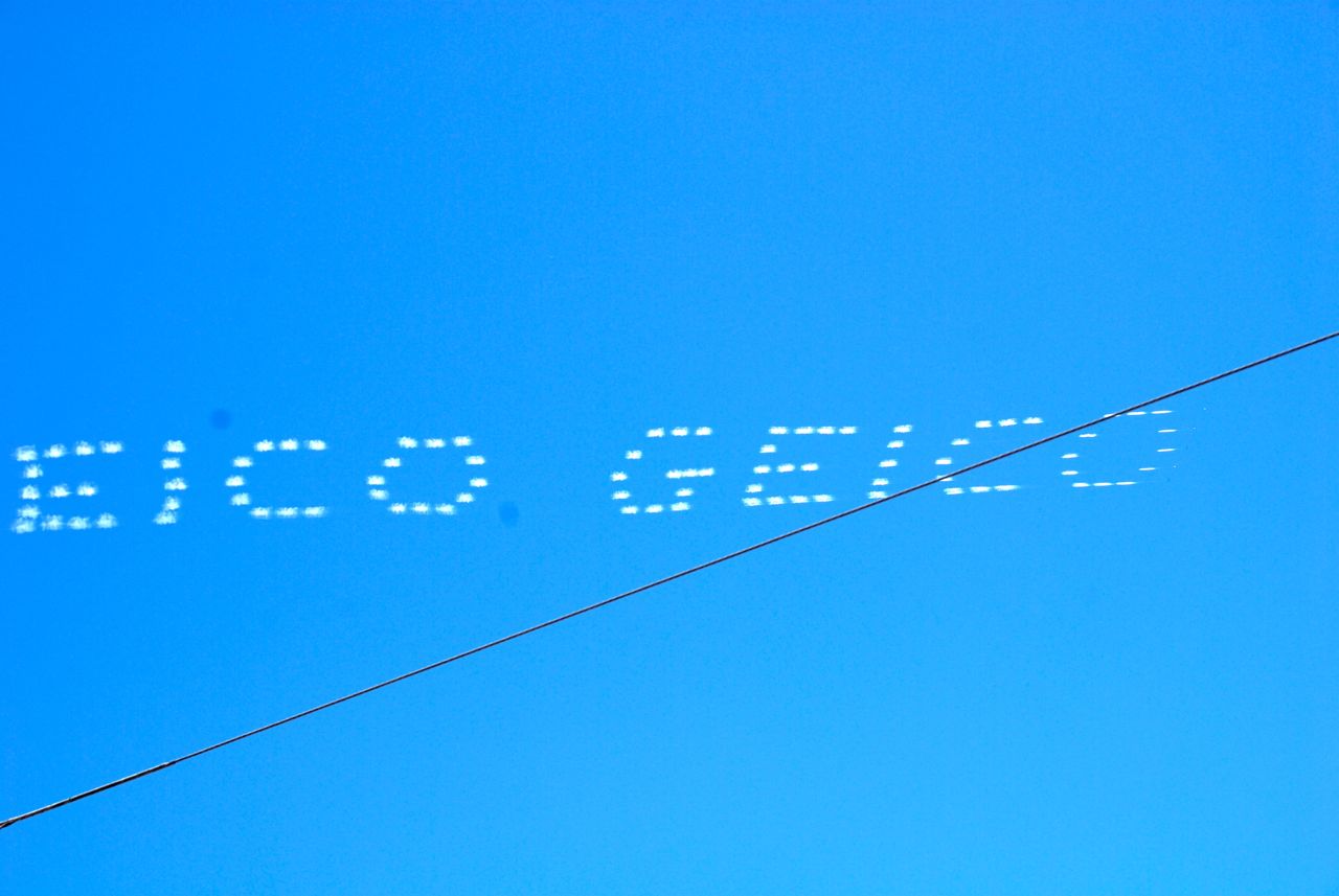 Penasaran bener saya, bagaimana caranya ya? Jelas itu bukan menggunakan spanduk yang ditarik oleh pesawat terbang, yang biasa saya lihat di film2. Ini benar2 tulisan di udara.