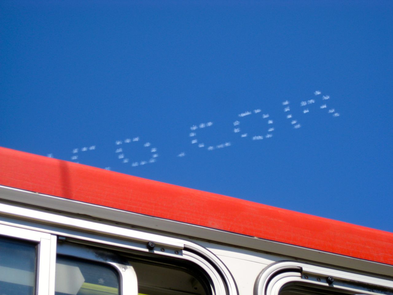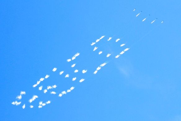 Tulisan di atas bukan spanduk yang ditarik pesawat, tetapi benar tulisan di langit, yang mulai menghilang karena ditiup angin. Coba perhatikan: