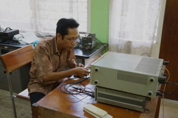 Di dalam ada beberapa anak SMA / STM yang rupanya sedang kerja praktek atau mengerjakan tugas, tidak tampak mahasiswa sama sekali. Saya sempat terpana melihat beberapa peralatan yang masih sama seperti tahun 1983 yang lalu, dua puluh Sembilan tahun yang lalu.