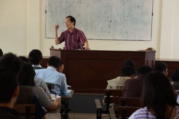 Kami sempat mengobrol sebentar sembari menemani beliau menuju ruang kelas dia mengajar di gedung E, itu tuh gedung yang penuh dengan bidadarinya wkwkwkwk… Saya juga sempat mendengarkan beliau mengajar sebentar.