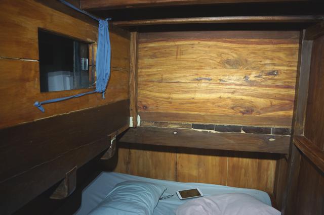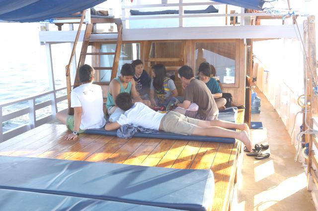 Sayapun bangun, naik ke dek atas untuk memeriksa apa yang menutup jendela itu. Terhuyung-huyung seperti pendekar mabok, saya akhirnya tiba di dek. Ehhh ternyata dek ditutup terpal karena hujan semalam. Terpal itu diganjal menggunakan tabung udara, pemberat untuk penyelaman dan segala barang yang bisa digunakan untuk menindih terpal supaya tidak diterbangkan angin.