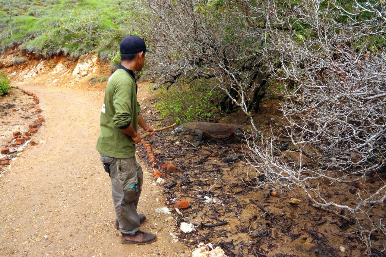 Pemandu terdepan segera mengusir komodo yang sedang bergerak mendekati kami dengan tongkat bercabangnya. Sementara ranger kedua menanyakan kami kenapa kok berjalan tanpa pemandu, yang tentu saja dengan mudah saya jelaskan. Lha gimana mau pakai pemandu, wong seekor manusiapun tidak ada yang berjaga di dermaga.4 komodo di jalan masuk
