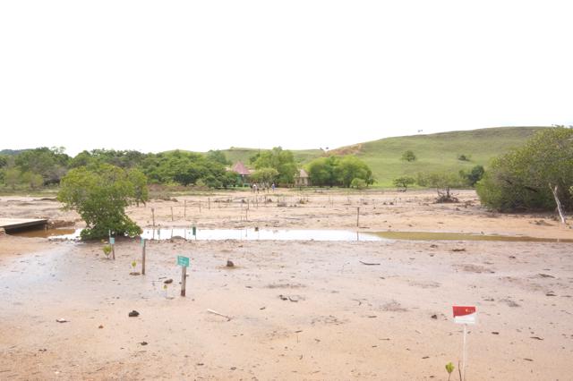 Kamipun segera masuk beriringan melewati jalan setapak yang becek disana-sini. Disisi kiri kami terdapat dinding landai dari sebuah bukit, sedangkan disisi kanan terdapat hutan bakau yang masih menyisakan air laut dari pasang semalamnya.