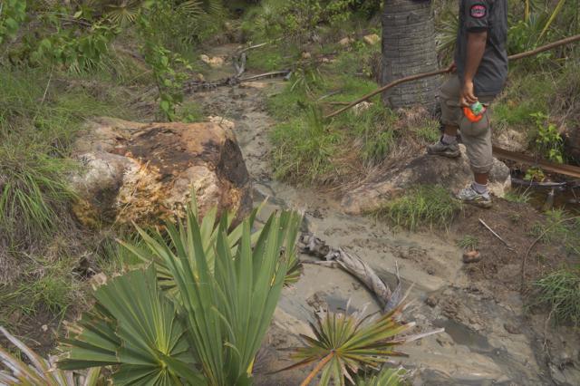 Kami terus berjalan menurun dan melalui beberapa parit yang becek hingga akhirnya tiba di sebuah sungai yang sering digunakan sebagai tempat berkumpulnya kerbau pada musim panas. Kami beristirahat sejenak disini.