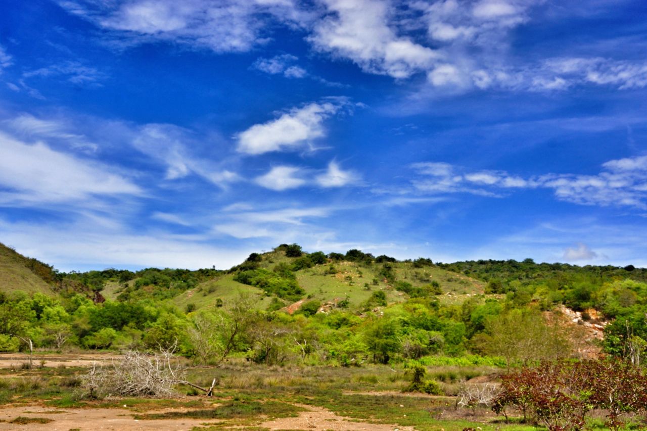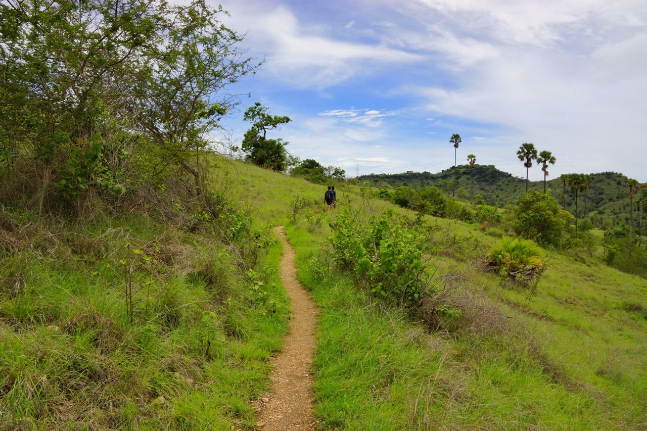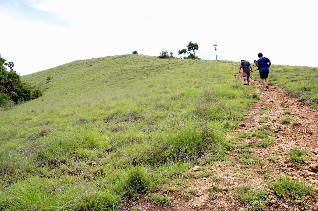 Sekitar 30 – 45 menit perjalanan, kami tiba di puncak bukit dengan pemandangan yang lumayan indah. Disana-sini hanya tampak padang savanna dengan latar belakang laut membiru. Saya beberapa kali harus berhenti, berpura-pura mengambil foto padahal karena terengah-engah kehabisan nafas hehehehe….