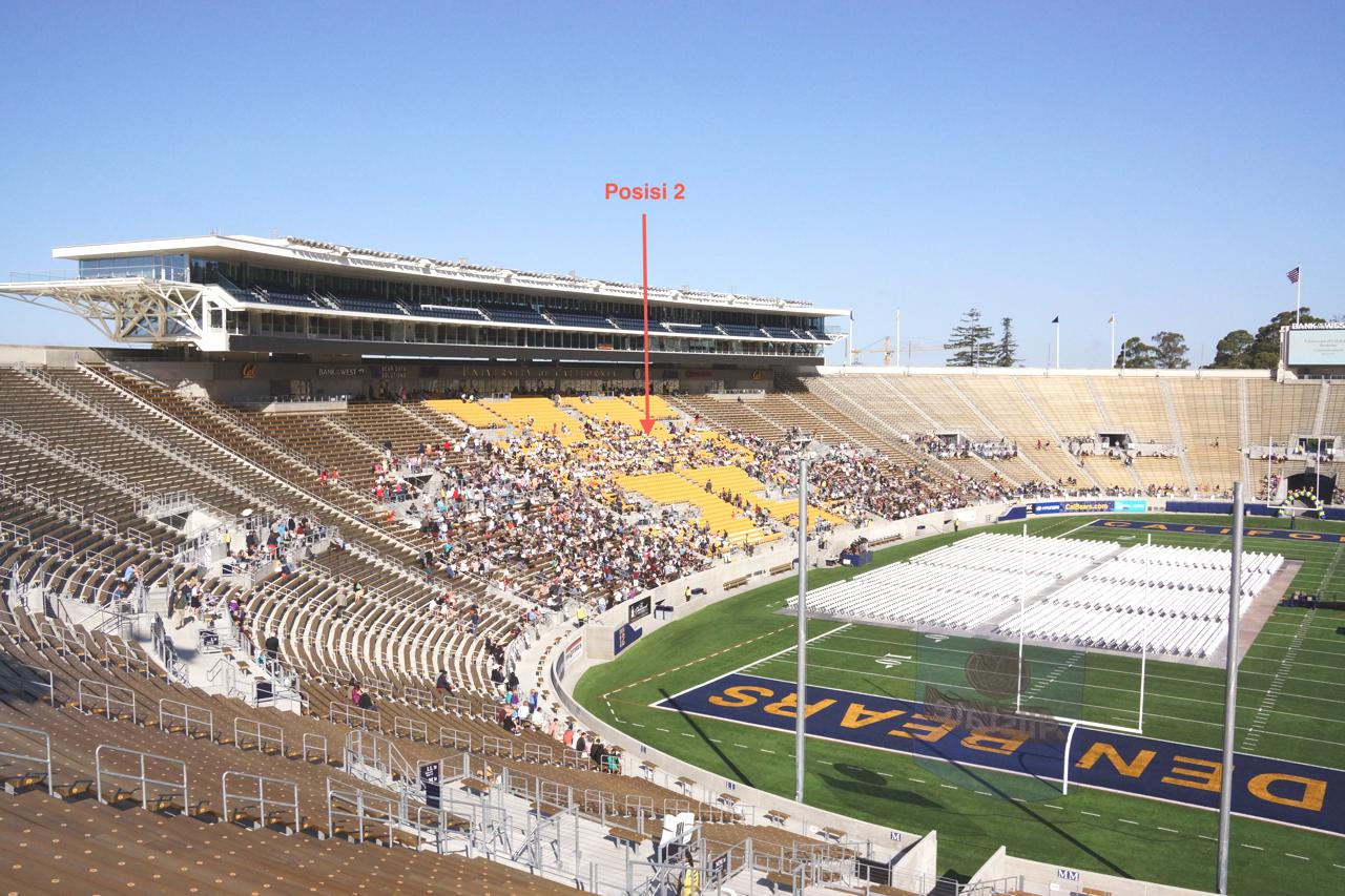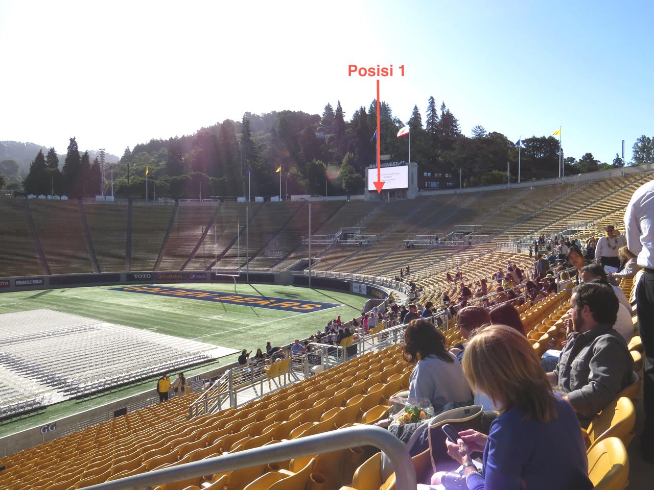 Foto di bawah ini saya ambil dari posisi 1 di bawah LCD raksasa di ujung stadium ke tempat duduk anak saya, Calvin (posisi 2), menggunakan SONY NEX-7.