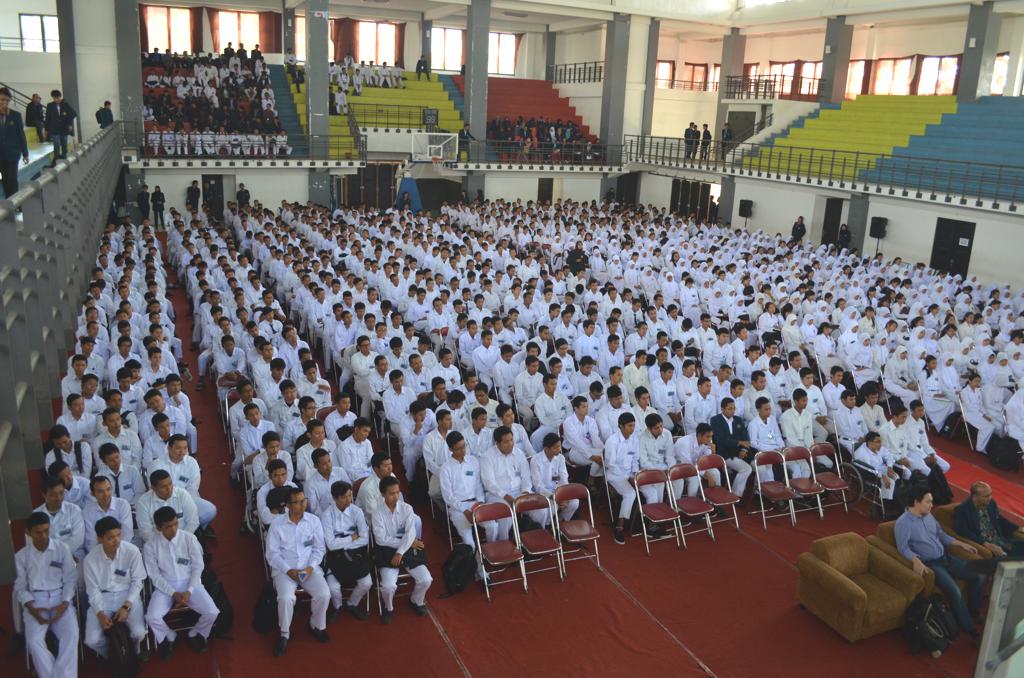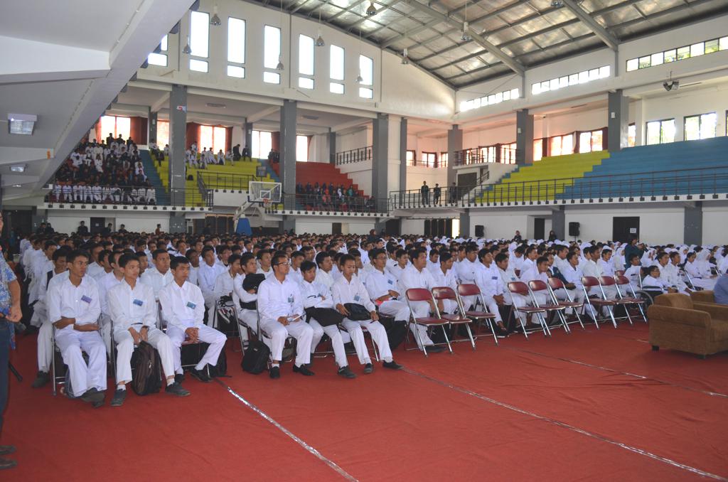Saya bergegas turun disambut oleh Panitia yang tampak cemas, dan juga pak Sutrisno yang sudah menunggu di pelataran depan gedung. Sembari berjalan cepat memasuki ruangan, saya meminta maaf atas kesalahan informasi yang saya terima. Dan begitu melalui pintu masuk, sayapun tertegun dengan pemandangan di dalam GOR. Ternyata ruangan sudah penuh dengan mahasiswa berseragam putih2 duduk rapi berderet hampir memenuhi 80% ruangan.