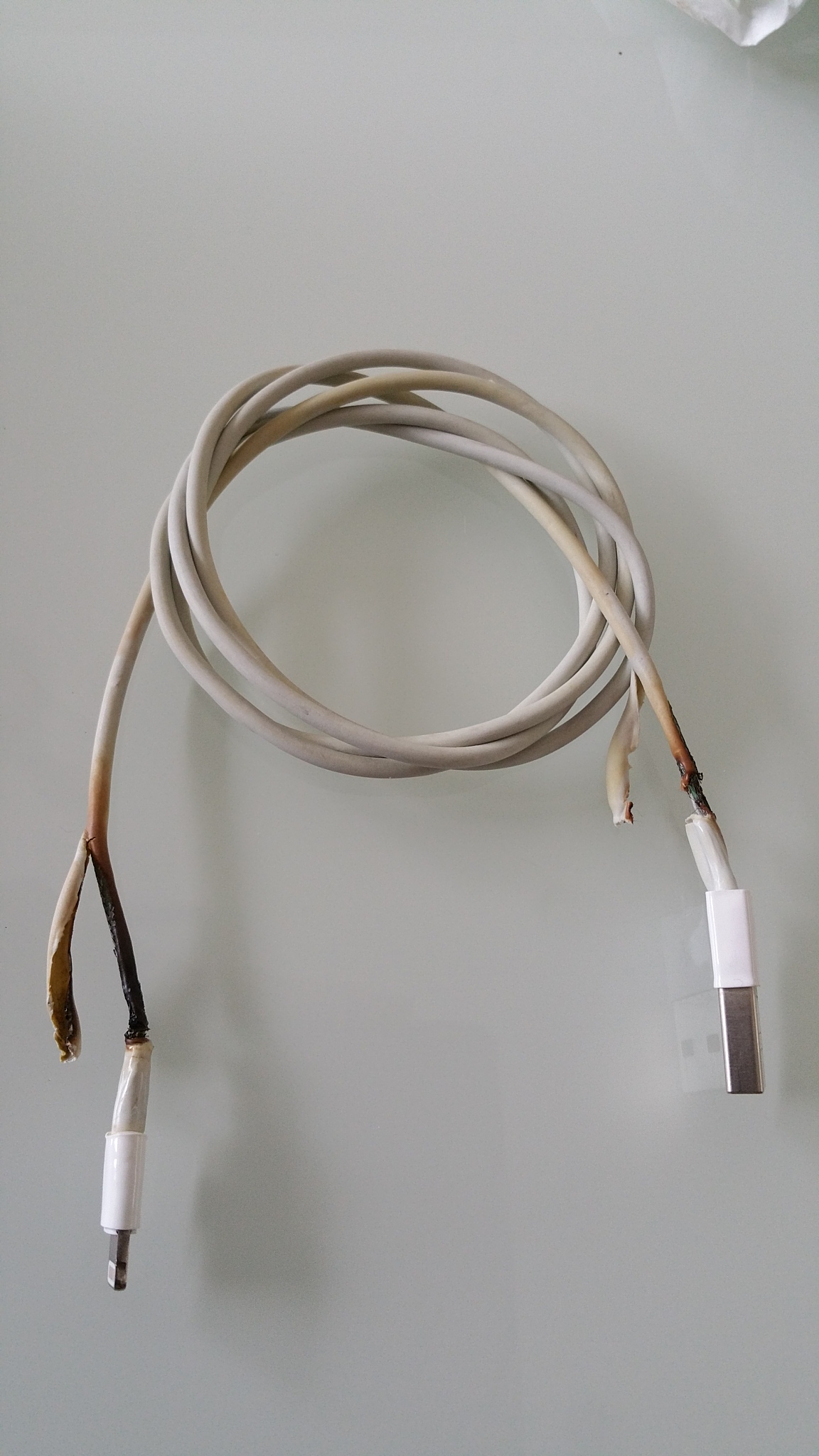 Saya cepat2 bangun untuk mencabut kabel dari chargernya, dan ternyata kedua sisi sudah hangus terbakar. Api memang hanya menyala sebentar, namun saya rasa cukup untuk membakar kasur jika ketika itu menempel di kasur saya.