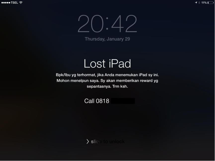 Selanjutnya kita bisa mengetikkan message yang akan tampil di layar iPad jika yang menemukan menghidupkan iPad kita. Sayapun bergegas mengetikkan kalimat yang sopan dan memelas agar penemunya bersedia mengembalikan.