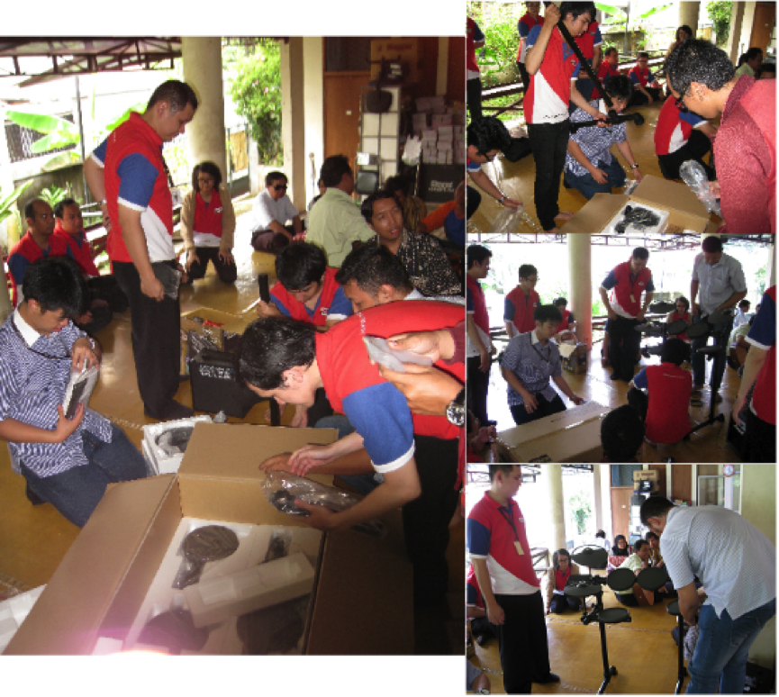 Hari H, setelah berbincang pak Toto menyerahkan drum ke pihak yayasan dan saya bersama team mengajarkan bagaimana merakit dan tunning drum, jujur ketika ingin mengajarkan saya bingung harus bagaimana mengajarkan ya ideal mereka.