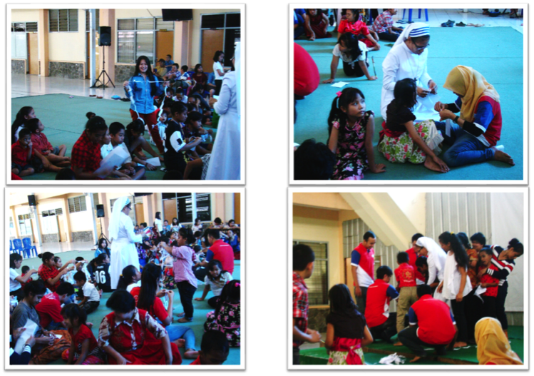 Kami di sana mengadakan acara games2, makan bersama, dan menyerahkan sumbangan. Saat games terbentuk suasana yang akrab dan menyenangkan disana kita memainkan 3 games menggambar, menara sedotan dan membuat lingkaran dari selembar kertas, mereka sangat antusias sekali dengan acara kami. Kami pun bisa membaur dan bercanda tawa dengan mereka.
