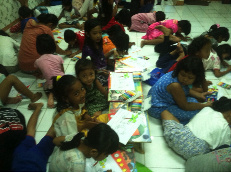 Kami melihat banyak anak-anak di lingkungan kejadian tersebut, kamipun berinisiatif untuk mengadakan satu acara lanjutan untuk berbagi dan menghibur adik-adik kami di sana. Kami yakin mereka tidak pernah menginginkan untuk merasakan kejadian itu dan kami juga yakin mereka trauma, oleh karena itu kami membuat satu acara mewarnai dan makan bersama di hari Sabtu ketika mereka libur sekolah.