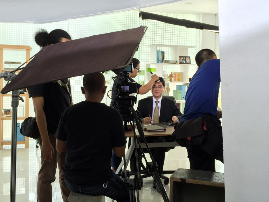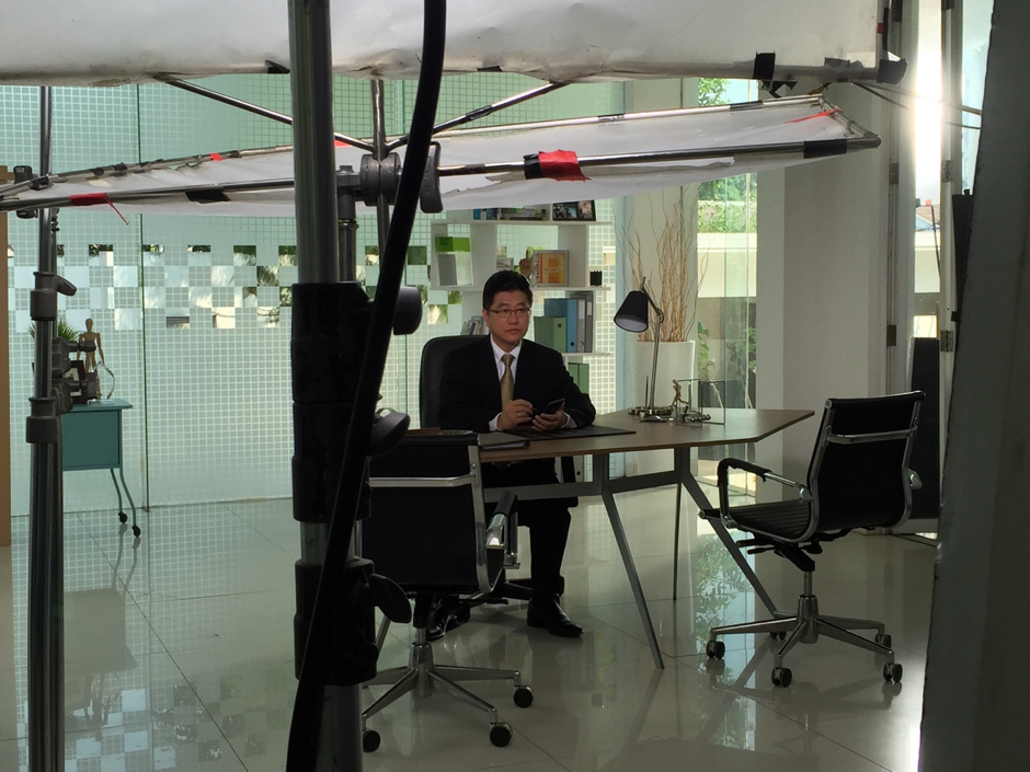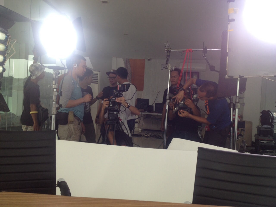 Di lokasi itu saya kaget keseriusan pengambilan video ini, semua peralatan bertebaran dimana-mana… tampak beberapa orang sedang mengatur lampu, camera, mengatur setting meja yang akan dijadikan sebagai meja kerja saya, meletakkan pernik2 yang saya bawa dari kantor dan rumah agar tampak seperti di kantor sendiri.