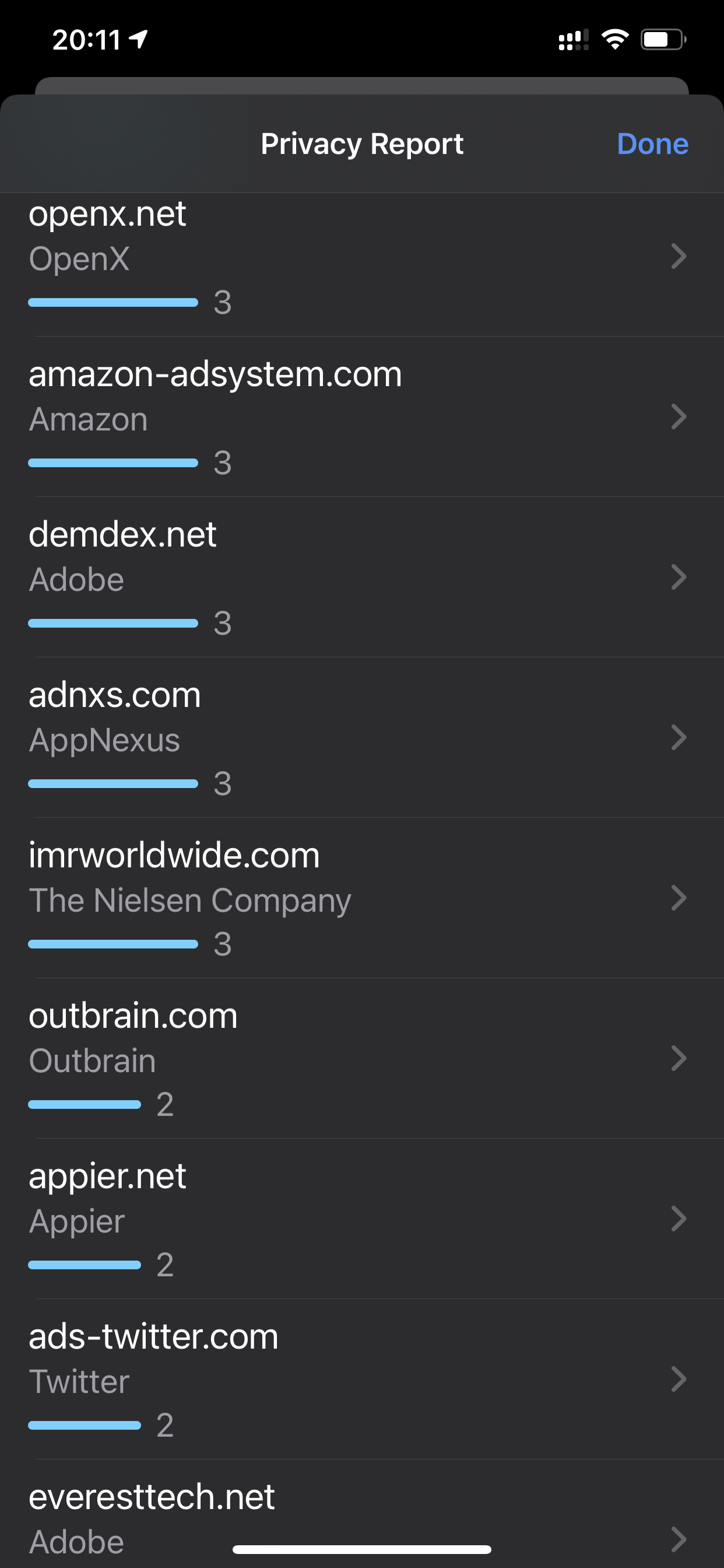 Saya kemudian mencoba mengakses beberapa website menggunakan Safari di iOS 14, dengan hasil yang menggetarkan hati saya. Coba lihat gimana gak ngeri. Hanya dari beberapa website, Privacy Report melaporkan ada 75 trackers yang “mencuri” atau lebih tepat “merampok” data browsing saya. Gila nggak???