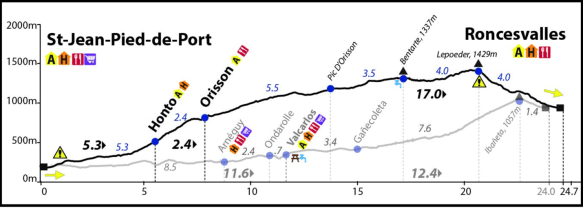 Jarak SJPP ke Roncesvalles kurang lebih 26.1 kilometer jauhnya. Saya bayangkan, tanpa membawa ransel, dengan kondisi jalan rata seperti di perumahan saya saja, saya masih tidak yakin akan mampu menyelesaikannya dengan santai dalam sehari. Sedangkan kalau kita lihat peta di atas, medan SJPP – Roncesvalles selain jauh, juga mendaki tanpa henti dengan elevasi 1494 m dan menurun 721m. Perhatikan: jalan mendaki sejauh 20 kilometer lebih, dan kemudian menurun hampir 5 kilometer…